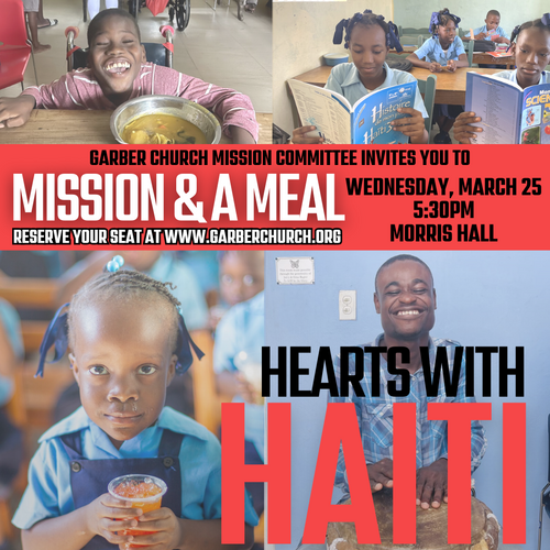 Emily Everette, the Hearts with Haiti Executive Director, will be visiting Garber on March 25 to give updates on our friends in Haiti and the good work that God continues to do through this ministry.