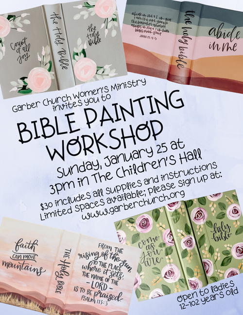 Join us for a Bible Painting Workshop hosted by Garber Church's Women's Ministry, on Sunday, January 25 at 3pm: this creative and faith-filled experience for women ages 12 to 102. For $30 per person (due by January 18), participants will receive all supplies (ESV Bible, paint, and brushes) and guidance, making it perfect for beginners and experienced artists alike. Come connect, create, and reflect through art and Scripture.